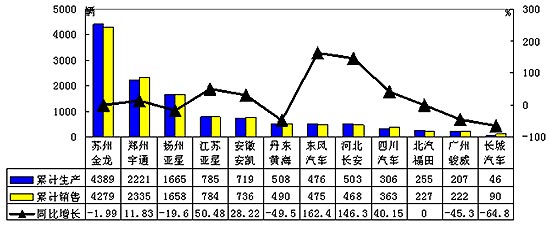 2005年1-8月中客整车主要企业累计产销量及销量同比增长率