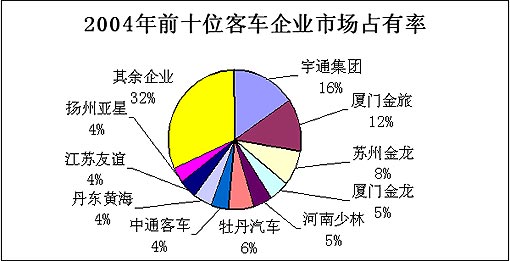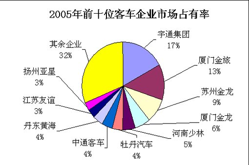 2005年客车行业前十位客车企业的市场集中度基本上没有什么变化,仍保持在68%的水平,但前4位客车企业的市场份额却分别扩大了1个百分点(即:宇通17%、金旅13%、苏龙9%、厦龙6%),而且基本保持了2位数的增长速度(即:宇通10.48%、金旅9.98%、苏龙11.81%、厦龙30.35%),而后6位企业的情况却难以乐观,少林客车增长了5.89%,中通客车当好持平(0.04%),而黄海、友谊、亚星和牡丹的销量却有明显程度的下降。可见,前十位企业间的差距正在拉大,分化现象日显突出。总之,2005年少数企业销量略有增长或基本持平,多数企业的销量出现了不同程度的下降,而且平均降幅要明显大于增幅。