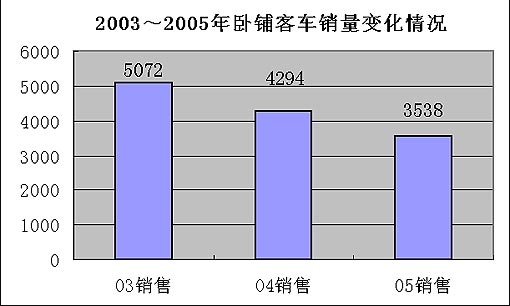 长途卧铺市场明显萎缩,市场份额继续下降,由2003年的6%降至2004年的4%,再降至3%。其销量分别为5072辆、4294辆和3538辆,降速超过了15%。这充分反映了我国道路条件的改善,使行车时间大大缩短,原来需要卧铺车行驶的线路现在改为座位车行驶。另外,铁路的提速和直达运行,也对原卧铺客车运行的线路产生一定的影响。在这些因素的共同作用下,长途卧铺客车市场的萎缩是必然的现象,是我国交通客运体系进步的结果。