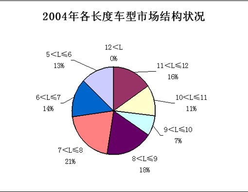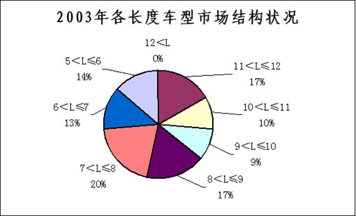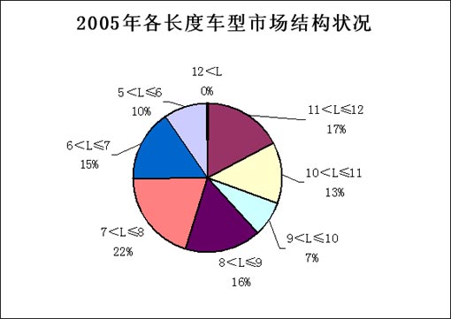 各类长度车型在总销量中的份额也发生着微妙变化:10~11米客车由2003年的10%提高至2005年的13%,2004年为11%;7~8米客车和6~7客车分别由2003年的20%和13%提高至2005年的22%和15%,2004年各为21%和14%;而9~10米和5~6米客车则分别由9%和14%下降至2005年的7%和10%;11~12米客车基本保持在17%的水平。