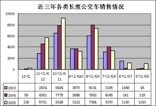 2005年10米以上公交客车(14930辆)的增长率为20.83%,远高于该级别客车(33857辆)13.71%的增长速度,其中,10~11米公交客车(9199辆)的增速为18.32%,与该级别客车(14543辆)的增速基本相同(18.72%),而11~12米公交客车(5731辆)的增速为25.10%,要高于这一级别客车(19314辆)增速(10.22%)15个百分点。而7~10米这一区间长度的公交车销量却出现了不同程度的下降,5~6米和6~7米公交车却出现了一定程度的增长。