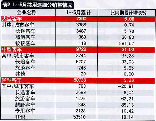 从表1可以看出,与4月比,5月的客车市场仍然下滑,但是与去年同期比较则是普遍实现较大幅度增长,表现最为突出的是中型和轻型客车。