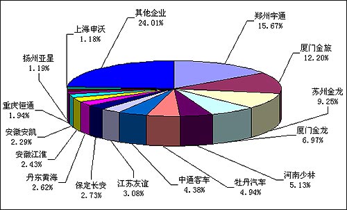 2006年9月份全国大中型客生产企业共计生产各种类型的客车14386辆,销售各类客车14601辆。其中,市场占有率前十五名的企业共计生产各类客车11057辆,销售各类客车11096辆,占据了市场72.99%的份额。