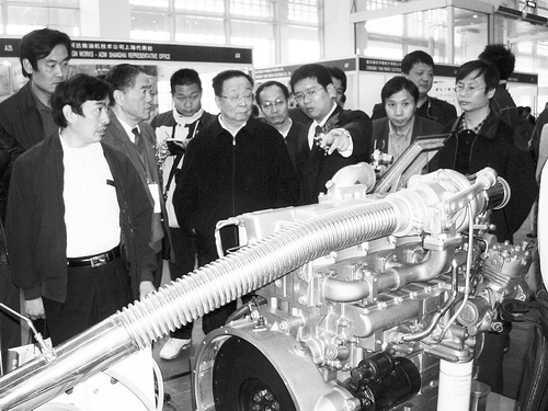 玉柴营销公司总裁吴其伟(前排右三)在向全国政协委员、中国机械工业联合会会长、原轻工业部部长、国家经贸委副主任于珍(前排右五)介绍玉柴欧Ⅳ重型发动机。前排左二为中国内燃机工业协会理事长倪宏杰,前排右一为玉柴常务副总经理梁和平。