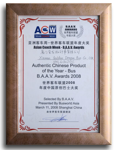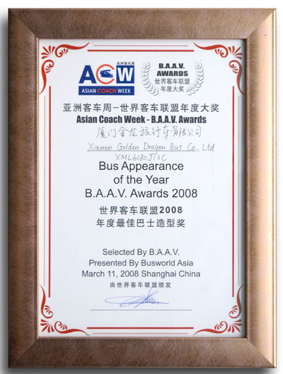 2008年3月11日晚,一年一度的"亚洲客车周--世界客车联盟年度大奖颁奖典礼"如期举行。厦门金旅XML6180