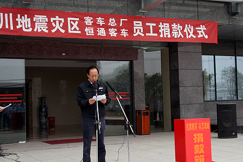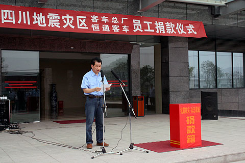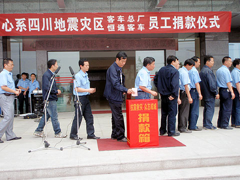 2008年5月15日13点30分,随着国歌的奏起,重庆恒通客车“心系四川地震灾区,总厂、恒通员工捐款仪式”在肃穆的气氛中开始,常务副总唐乾栋主持了整个捐款仪式。在邓平总经理的带领下,恒通全体员工怀着沉痛的心情,深深的默哀以祭奠逝去的遇难者,为灾区的幸存者重建家园,重返校园伸出了一双双援助的手。