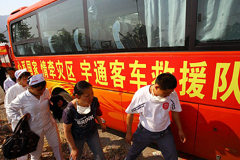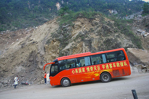 需要转移的这批医护人员原计划到汉旺,现在情况有变又决定到北川,马上出发。北川同样是此次地震的重灾区,于是,装载了药品、大型器械、帐篷等物资,宇通救援队和这批医护人员在下午四点多开始赶往北川。这一路很不好走,山上碎石随时可能掉下来,一些路面还坍塌了。