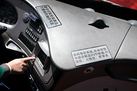 登上龙威XMQ6129Y的客舱,我就发现了一些新增的配置——导游视听系统,即在导游座的左前方操作台上安置了带夜间发光的视频摄像头和视频操作开关。