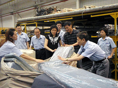 恒通客车工作人员向重庆市民政局领导演示床垫的使用