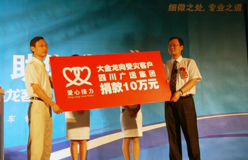 四川广元运输集团位于地震灾害严重的广元地区,属5.12地震严重受灾地区。5.12汶川大地震广元公司的各类建筑物包括车站站房、办公房、职工住宅以及各类车辆设施、设备都遭受了巨大损毁总经济损失超过一亿八千万元。大金龙市场部经理在得知这一消息后,立刻向公司高层领导做出请示,并自发组织向灾区客户进行捐款。随即,公司高层做出决定,向四川地震受灾严重的客户四川广元运输集团有限责任公司捐款十万元人民币,并派出售后服务技术团队对其受损车辆进行抢救性修复。