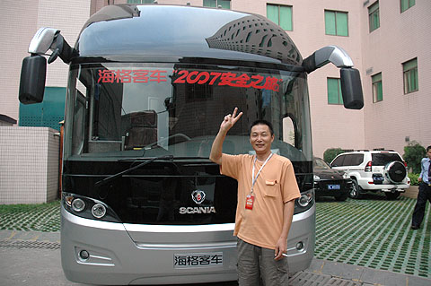 日前,海格客车"安全之旅"一行来到贵州省贵阳市,来自贵阳当地各级运输系统的企业领导参加了本次活动。三辆精品海格客车在贵阳丽豪大酒店外排成一列,引得当日到会的众多客户竞相驻足,仔细参观。记者随机采访了贵阳当地最有影响力和最具规模的几家客运企业领导,认真聆听了他们对于海格客车的评价。一位名叫温向阳的个体运输企业主在参观完展车后感触非常深,与记者现场聊起多年来使用海格客车的体会心得。