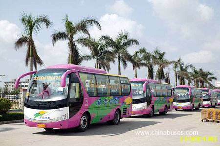 美丽的海滨城市三亚,正在沉浸在“两会一赛”的欢乐当中。宇通客车作为本次活动的指定接待用车,不仅在车身外观上添置了醒目的主题标语,而且各项接待工作排列紧张有序,使众多电影界人士乘坐起来相当舒适。目前,宇通16台豪华大巴仍在紧锣密鼓地嘉宾接待工作中。