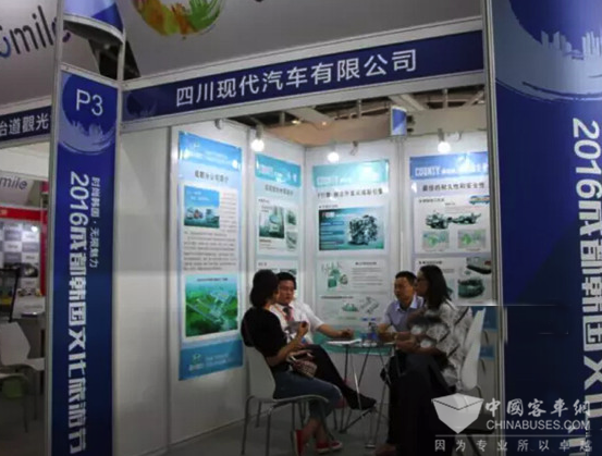 展区内四川现代汽车有限公司安排了专业的引导员对高端商旅巴士康恩迪做讲解,介绍了其独特的第三代共轨引擎系统,现场观众被该引擎高效的电子控制能力吸引,当听到康恩迪能够实现1,800bar超高燃料喷射的时候,现场观众无不表示惊叹。讲解中康恩迪的废气再循环(EGR)系统也是介绍的重点,该系统能够降低废气中的氧化氮(NOX)的排出量,并利用PMC贵金属催化降低CH、CO排出量,让废气排放标准达到欧四标准,同时还具备了排放标准升级的能力。