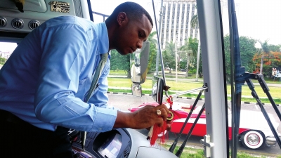 在古巴,宇通已成为一种文化符号深入人心,古巴人坐公交车习惯说“坐宇通”。宇通的名字曾登上古巴著名乐队“机密人士”的专辑封面。在2010年古巴50年国庆期间,曾有一首特别流行的歌曲名叫“我做古巴人、我爱宇通车”。图为当地大巴司机收到记者赠送的刻有宇通标志的中国结时,十分欣喜地将它挂起。