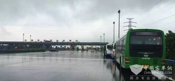 武汉公交四公司召集20台车在汉蔡高速收费站集合,扬扬家的车勇猛打前阵,赶往蔡甸消泗乡转移村民。
