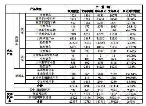 2016年6月份,福田汽车销售各类商用车39106辆,同比增长3.69%;1-6月,福田汽车累计销售商用车240271辆,同比下降6.48%。