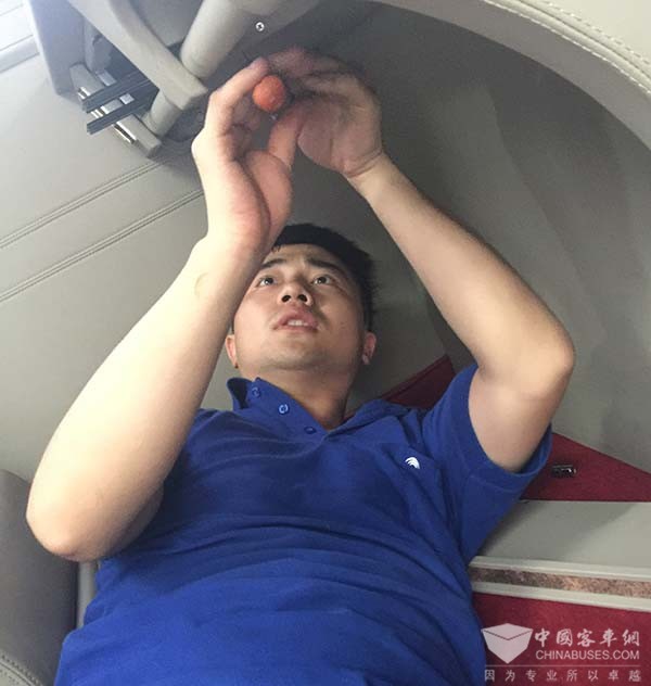 晚上10点,宇通G20服务保障人员刘要伟接到了G20组委会司机领队的求助电话。原来晚上9点领队在封存前例行检查时发现,一辆T7车在封闭式演练后车内留下一部分污渍,使用清水、抹布清洁没有任何效果,安排人员去超市采购泡沫清洁剂却发现在该商品在G20期间已暂时下架。