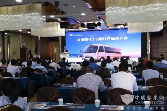 在发布会上,四川现代副总经理/销售本部长金基城发表演讲说:“四川现代康恩迪入市以来,在旅游和客运市场一直十分走俏,特别是旅游市场方面,康恩迪的品质已经得到了太白山、峨眉山、华山、泰山、关山、九寨沟、乾坤湾等景区的高度认可。今年我们全新推出了e-COUNTY新品,不仅在性价比方面更具优势,还保障了产品的卓越品质。相信这款中巴新品的出现,将会为广大用户创造更多经济价值。”