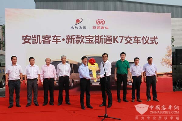 2016年9月23日,安凯宝斯通再次传来喜讯,35台汽油版宝斯通K7正式交付北京北汽出租汽车集团有限责任公司(以下简称北汽集团),将在未来与北汽集团携手共同保障各种政商重要场合的交通运输服务,提供更高效、更优质的服务保障。安凯客车董事长戴茂方出席交车仪式现场,并亲自将钥匙交付北汽集团董事长张峻峰。