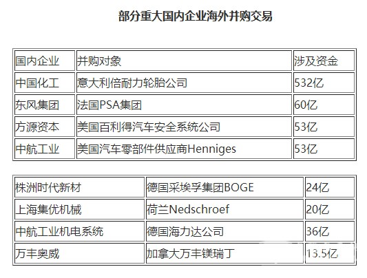 国内企业并购最多的是海外汽车零部件企业,这其中包括2015年9月,中航工业汽车5.72亿美元收购美国瀚德汽车控股有限公司。瀚德公司是世界一流的汽车密封和防震产品供应商,2014年实现销售收入8.25亿美元。