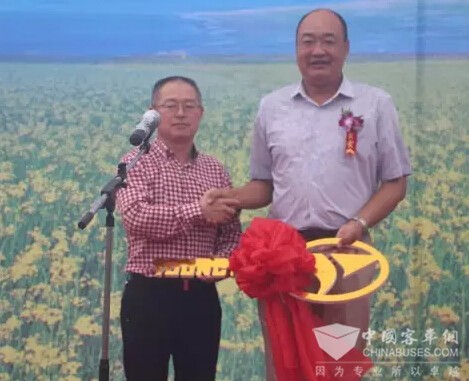青海青藏国际会务中心总经理南海峰先生和金华青年商用车有限公司副总经理叶银洪先生共同进行了金钥匙交接。
