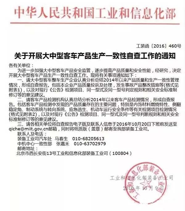2016年10月11日消息:日前,从工信部网站获悉,工业和信息化部装备工业司发布了《关于开展大中型客车产品生产一致性自查工作的通知》,要求相关企业开展自查工作,对产品质量进行进一步把关。具体内容如下: