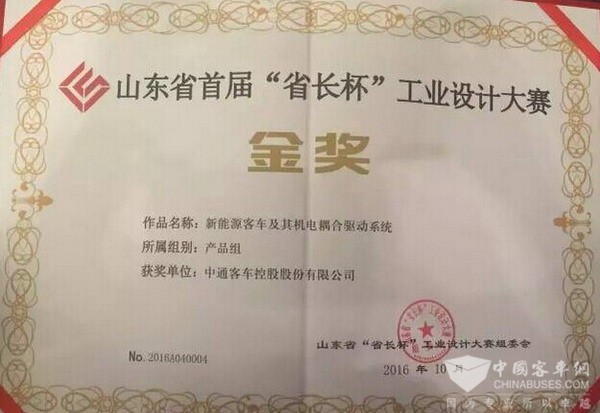 2016年10月13日,秋高气爽,金风习习,潍坊富华大酒店一号剧场,首届“省长杯”工业设计大赛颁奖典礼在此隆重举行,中通客车的“新能源客车及其机电耦合驱动系统”项目在三千多参赛项目中,脱颖而出,荣获金奖。该奖项可谓是工业设计中的“24K”的高品质金,为什么这么说?