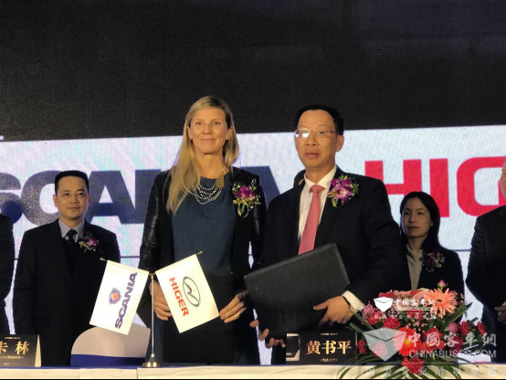 苏州金龙总经理黄书平(右)与斯堪尼亚客车部高级副总裁卡琳签署深度合作协议