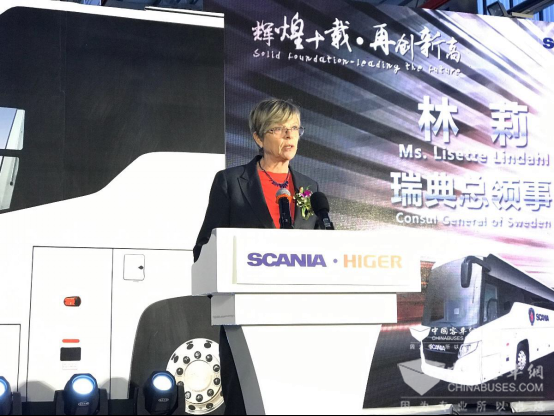 瑞典驻沪总领事林莉对斯堪尼亚与海格过去十年的合作成果表示充分肯定,她强调,公共交通是创造社会可持续发展的重要途径。斯堪尼亚与海格互相融合、优势互补,在过去的十年中将双品牌客车推广至全球许多国家,希望双方继往开来,通力合作,取得更大成功。
