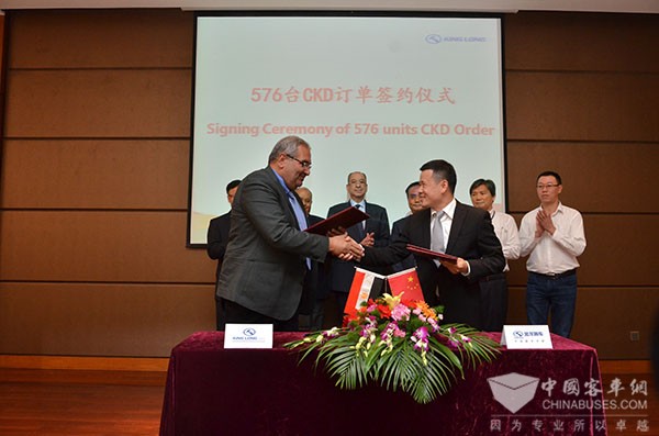 本次来访金龙客车,在观赏了专门拍摄的《金龙与KLE合作历程》纪录片后,KLE团队非常感动。“中国是埃及的好朋友,金龙客车也是KLE的好朋友。这个短片,让我们回顾成绩,也给了我们更多的信心,进一步加强合作。”他们由衷地感谢金龙客车多年来给予的一贯支持, 对未来合作充满期待,现场签订了576辆的CKD金威采购协议,被授予年度最佳特约经销商的荣誉。