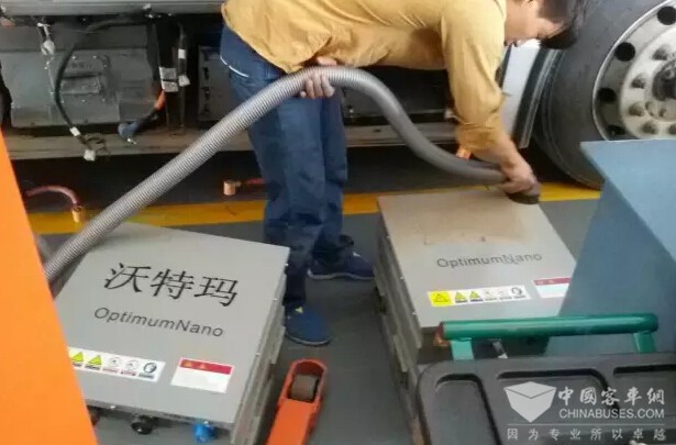 售后人员正在给南京金龙纯电动公交进行电池维护