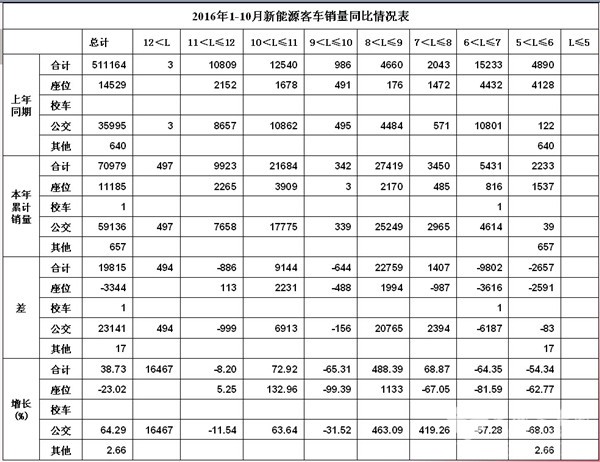 上述统计数据中,为新能源汽车推广应用做出巨大贡献的新能源公交车表现惨淡,其中5-6米的新能源公交车2016年前十个月仅销售39辆,同比下降68.03%,6-7米新能源公交车前十月销售4614辆,同比下降57.28%。