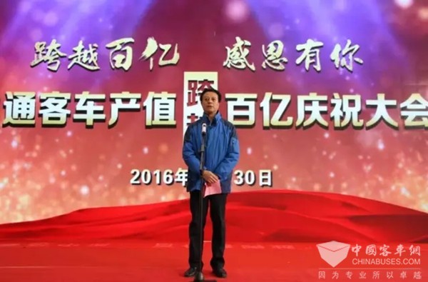上午10时17分,活动正式开始。孙庆民总经理首先发表致辞,向全体员工表达了祝贺和感谢,高度赞扬了中通客车全体员工当前的精神面貌。他表示,跨越百亿“攻坚战”的成功,是属于一代中通人的成功,大家共同开启了一个属于中通客车的新时代。产值百亿的突破,不仅标志着公司“双百亿”目标的完成,更为“十三五”的发展,乃至未来更长远的发展开了一个好头。