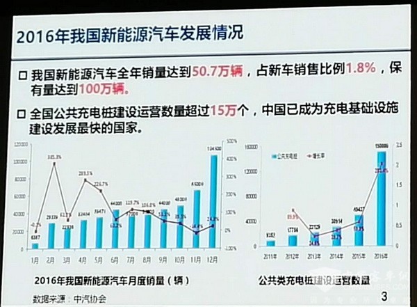 刚刚得到新的数据,有的来自中汽协会、有的来自中国汽研中心,数据告诉我们,我国新能源汽车据2016年全年的销量达到了50.7万辆,占新车销售比例的1.8%,中国的保有量达到了100万辆。全国的公共充电桩运营数字超过了15万个,这里讲的是公共用的充电桩,中国已经成为充电基础设施建设发展最快的国家。