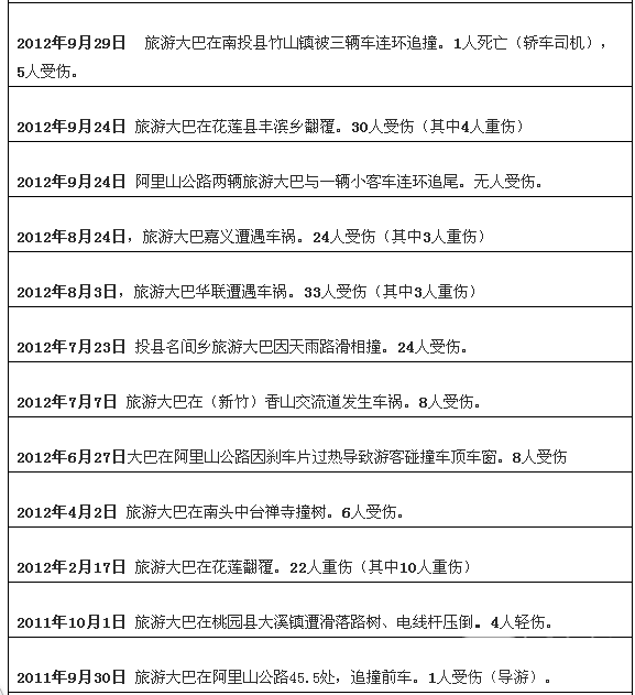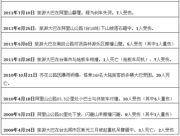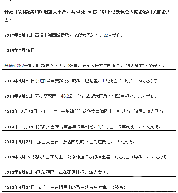 据完美作业网有免费视频不完全统计,从当前倒推至2009年,台湾发生过多起旅游大巴事故,其中仅涉及到大陆游客的旅游大巴事故就有30起,共造成54人死亡,330人轻重伤(2017年2月13日事故未见陆客报道,未做统计),具体情况见下表: