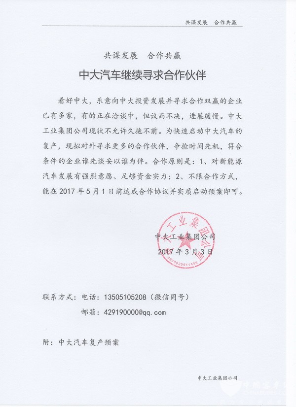 日前,中大汽车正积极寻求合作伙伴。据中大汽车介绍,目前乐意向中大投资发展并寻求合作双赢的企业已有多家,有的正在洽谈中,但议而不决,进展缓慢。中大工业集团公司现状不允许久拖不前。为快速启动中大汽车的复产,现拟对外寻求更多的合作伙伴,争抢时间先机。