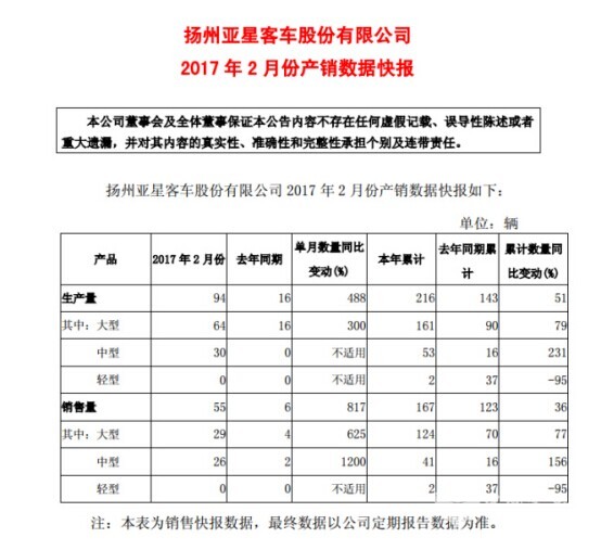 数据显示,亚星生产大型客车64辆,销售大型客车29辆,分别同比增长300%和817%;生产中型客车30辆,销售中型客车26辆,中型客车销量同比增长1200%。