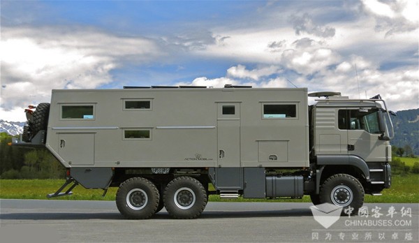 尽管外形看上去像是坦克,但汽车生产商Action Mobil推出的这款GLOBECRUISER FAMILY 7500是一辆适合环球旅行的移动房车。