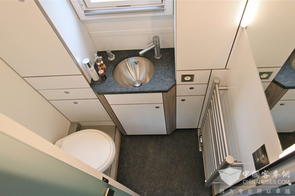 内部居住面积超过23平方英尺,配备卫星电视、洗衣机、烘干机、冰箱、独立浴室、衣柜及双人床等,车后还有一个平台,可以停放摩托车。