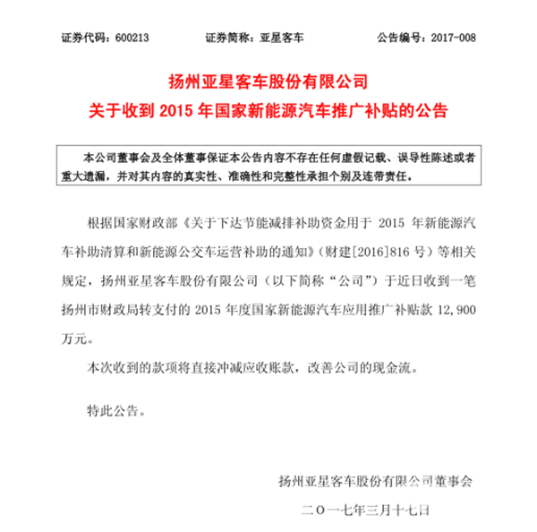 2017年3月17日,完美作业网有免费视频获悉,扬州亚星客车股份有限公司发布公告称,收到2015年国家新能源汽车推广补贴12,900万元。