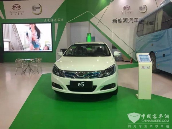 本次展会,比亚迪在出租车领域展出的是e5电动出租车。e5是一款低能耗、高性价比的纯电动三厢五座轿车,搭载了动力强劲、技术先进的铁电池,最高时速超过130km/h,续航里程超过300公里。凭借优秀的性能和突出的环保效益,比亚迪电动出租车已在深圳、太原、北京、南京、杭州、武汉、珠海等多个城市规模化投放并成功运营。其中深圳推广比亚迪电动出租车已超过5500辆,太原推广比亚迪电动出租车超过8000辆,成为全球首个实现出租车全电动化的城市。