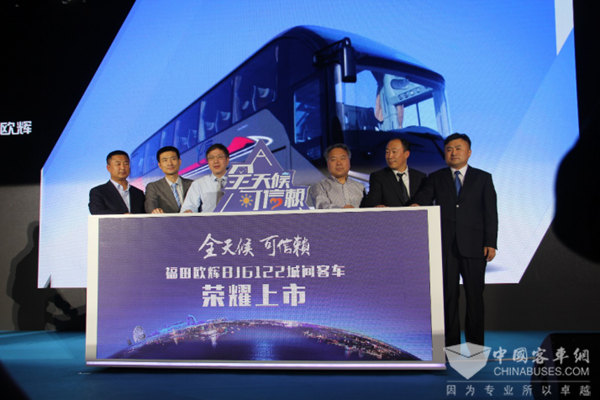 福田欧辉BJ6122城间客车在北京区域成功上市推介会上,中国公路学会客车分会副秘书长佘振清,交通运输部科学研究院高级工程师、交通科技传媒总编熊燕舞,福田汽车欧辉客车事业部副总经理、国内营销公司总经理刘国强,福田汽车欧辉客车事业部国内营销公司执行副总经理、城间客车业务总监于崇,福田汽车欧辉客车事业部国内营销公司京晋大区总经理王剑华,共同发布了福田欧辉BJ6122高端城间客车,该产品集智能、科技、绿色于一身。该车承载互联网精神,打破区域界线,通过链合全球资源,以戴勒姆生产工艺标准严格要求,配置康明斯强劲动力。作为一款极具科技感和价值感的“超级客车”,e客集“e安全、e可靠、e控制、e配置、e节能”于一体,针对黄金线路定制设计,并可提供双风挡和一层半两款外形选择。