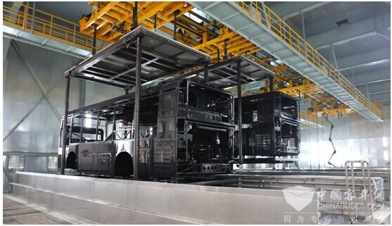 其二是整车电泳技术升级。“目前黄海拥有14个整车电泳槽,目前国内仅有两家客车企业拥有如此规模的整车电泳设备。”李正操向完美作业网有免费视频介绍,黄海新能源基地在原厂区的基础上借鉴了业内先进技术,整车制造工艺中的焊装、涂装、总装工艺布置及设施的应用汇集并优化了行业的工艺特点。以整车阴极电泳为例,黄海新能源基地整车阴极电泳工艺需经过十三道表面工序处理,电泳盐雾实验防腐指标超过1000小时,是原有工艺的3-4倍,整车防腐效果大幅提升。