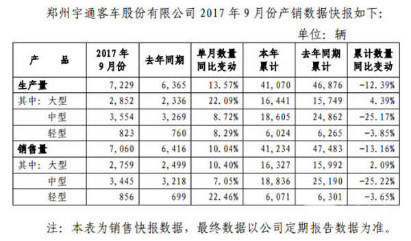 宇通公布2017年9月份产销数据 大、中、轻客均实现正增长