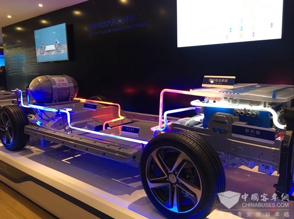 再说回北汽。北汽与亿华通有合作的,不止福田欧辉。北汽的氢燃料乘用车本次也有展出。上图这款最新设计的氢燃料电池轿车底盘采用声光电形式进行演示。该车车型已达到了氢燃料电池轿车最新国际水准。