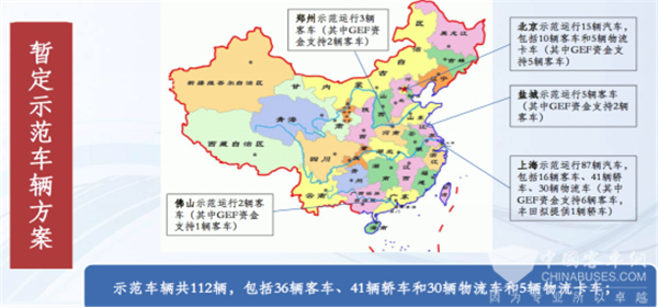 2016年8月31日,由全球环境基金(GEF)、联合国开发计划署(UNDP)支持,科技部、财政部联合北京市、上海市、河南省、广东省和江苏省政府共同实施的“促进中国燃料电池汽车商业化发展”项目正式启动(简称GEF三期),分别在北京、上海、佛山、郑州、盐城等国内5个城市,示范运行推广112辆燃料电池汽车,其中包括36辆客车、41辆轿车、30辆物流车和5辆物流卡车。