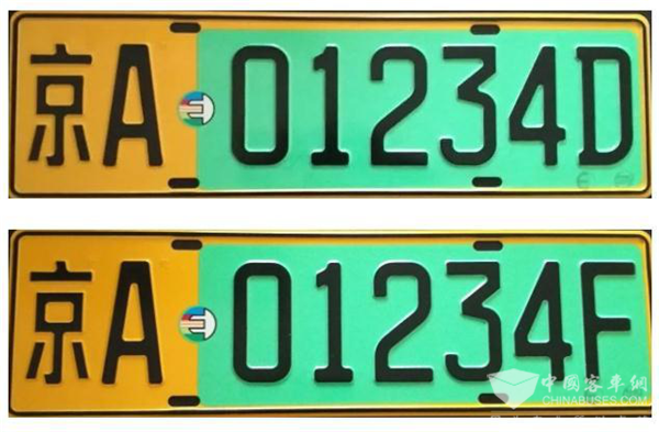 而新能源汽车号牌分为小型新能源汽车号牌和大型新能源汽车号牌。其中小型新能源汽车号牌为渐变绿色,大型新能源汽车号牌为黄绿双拼色。小型新能源汽车专用号牌的第一位先启用字母D、F(D代表纯电动新能源汽车,F代表非纯电动新能源汽车),大型新能源汽车专用号牌的第六位先启用字母D、F(D代表纯电动新能源汽车,F代表非纯电动新能源汽车)。