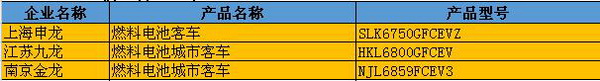 本次公告中,燃料电池产品共5家企业11个型号。中通客车、东风汽车、南京金龙、上海申龙、江苏九龙在列;其中,东风汽车和中通客车入选车型最多,都有4款车型及产品入选。