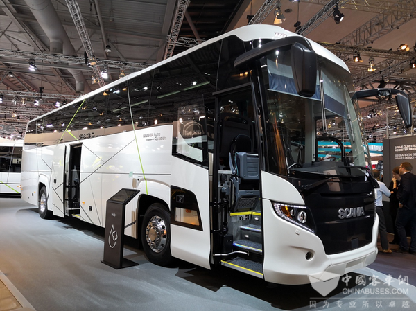 此次展出的斯堪尼亚·海格统领客车,是斯堪尼亚·海格品牌的一款经典车型,并不断升级而来。该车长13米、宽2.55米、高3.8米,采用“49+1+1”座,单侧双开门设计,发动机采用13升直列6缸生物柴油或生物燃油(HVO)发动机,最大功率为410马力(302千瓦),最大转速1900转/分,最大扭矩为2150牛·米,加上SCR系统,可以轻松满足欧六排放标准,具有高环保性。