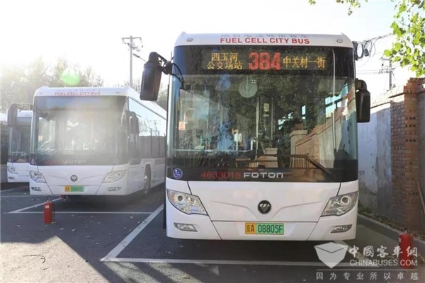 2018年10月27日,由西玉河公交场站开往中关村一街的北京384路线路公交迎来了福田欧辉BJ6123FCEVCH-1型氢燃料电池客车的首秀,这意味着北京公交开始了氢燃料电池客车的示范运营。